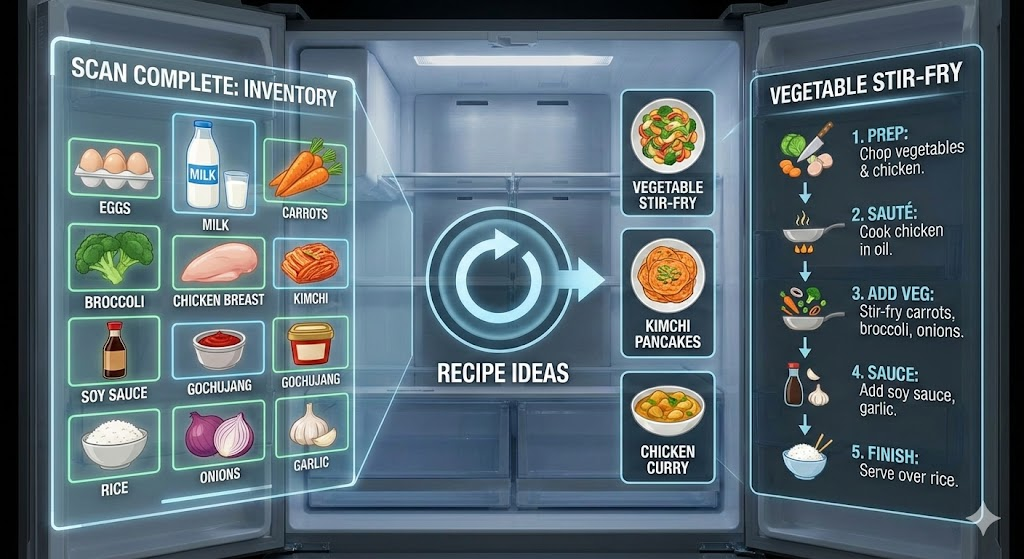 냉장고 안에 무엇이 있는지 스캔하고, 간단한 인포그래픽 형태로 자세한 단계별 요리법과 함께 해당 재료로 무엇을 요리할 수 있는지 아이디어를 제공하는 이미지를 생성해주세요.