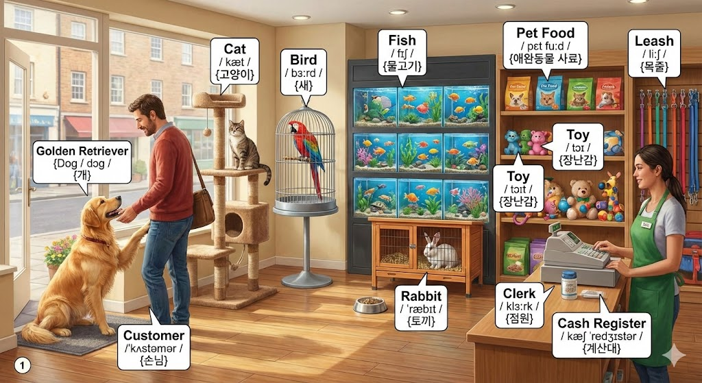 {{애완동물 가게}} 장면을 자세히 그리고 각 사물에 영어 단어를 적어 넣으세요. 라벨 형식: 첫째 줄: 영어 단어. 둘째 줄: IPA 발음. 셋째 줄: {한국어} 번역.